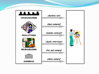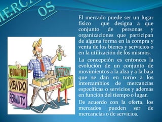 Este documento describe diferentes tipos de mercados, incluyendo mercados de consumo para bienes de consumo inmediato y duradero, mercados industriales y de servicios, mercados de cambio, mercados de tránsito, mercados centrales mayoristas, mercados potenciales y mercados negros. Define cada tipo de mercado y ofrece ejemplos.