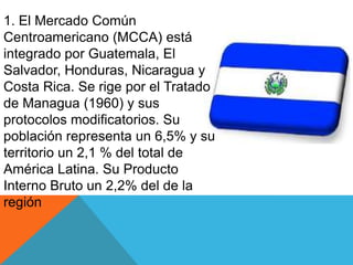 El Mercado Común Centroamericano (MCCA) está integrado por 5 países centroamericanos y busca promover la integración económica regional desde 1960. A pesar de su antigüedad, el MCCA no se convirtió en una entidad económica importante hasta la década de 1980. En la actualidad, el MCCA sigue enfrentando desafíos como la pobreza, el medio ambiente y lograr una integración equitativa entre sus miembros.