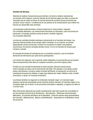 El mercado de divisas es el mercado donde se intercambian diferentes monedas extranjeras. Participan bancos, empresas multinacionales, instituciones financieras y bancos centrales que compran y venden divisas. Esto facilita el comercio internacional al permitir transferir poder adquisitivo entre naciones a través de la compra y venta de divisas.