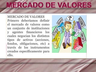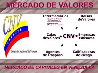 Este documento describe el mercado de valores y su marco legal en Venezuela. Explica que el mercado de valores está compuesto por mercados primarios y secundarios. El mercado primario se refiere a la emisión inicial de valores, mientras que el mercado secundario es donde los valores ya emitidos son negociados. También presenta las leyes que regulan el mercado de valores en Venezuela.