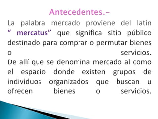 El documento describe el concepto de mercado laboral y sus características principales. Explica que el mercado laboral está constituido por las oportunidades de empleo y los recursos humanos disponibles. Se generan tres situaciones posibles dependiendo de si hay más oferta de empleos que candidatos, equilibrio entre oferta y demanda, o más candidatos que empleos. También describe el perfil del trabajador demandado por las empresas.