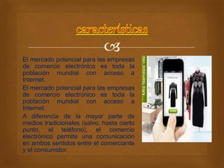 El documento describe las ventajas y desventajas del comercio electrónico para empresas y consumidores. El mercado potencial para el comercio electrónico es la población mundial con acceso a Internet. A diferencia de los medios tradicionales, el comercio electrónico permite la comunicación bidireccional entre vendedores y compradores. Algunas ventajas para los consumidores son encontrar productos a menor costo y realizar compras desde casa de manera cómoda. Sin embargo, también existen desventajas como la pérdida de la capacidad de