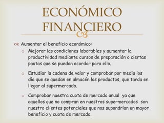 Este documento propone varias medidas para mejorar el rendimiento económico y la satisfacción de los clientes en una empresa de supermercados. Entre ellas, mejorar la productividad de los trabajadores, reducir costes de distribución, fidelizar a los clientes mediante promociones y tarjetas, y garantizar la máxima calidad y frescura de los productos.
