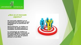 Este documento explica el concepto de mercado objetivo y cómo definirlo. Un mercado objetivo es el segmento al que se dirige un producto, generalmente definido por variables demográficas como edad, género y clase socioeconómica. Definir el mercado objetivo mediante estas variables y otras cualitativas como intereses y estilo de vida permite segmentar el mercado y adaptar mejor la oferta. Esto optimiza recursos y ayuda a generar ideas de producto.