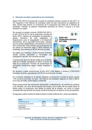 Este documento analiza el mercado mundial de productos lácteos y las perspectivas de Chile en este mercado hacia el año 2020. Se proyecta que la producción mundial de leche crecerá un 1.9% anual hasta alcanzar 852.8 millones de toneladas en 2020, impulsada principalmente por países en desarrollo como India y China. Asimismo, se espera que el consumo per cápita continúe aumentando. Chile deberá aumentar su producción lechera para satisfacer la creciente demanda interna y capturar oportunidades en