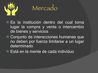 El documento describe los conceptos clave del mercado y la competencia. Explica que el mercado es donde ocurre el intercambio de bienes y servicios entre compradores y vendedores. Señala diferentes tipos de mercados como el mercado común, mercado negro, mercado primario y secundario. También describe la competencia perfecta e imperfecta y diferentes formas como monopolio y oligopolio. Resalta que la competencia es esencial para la economía de mercado y promueve el interés público.