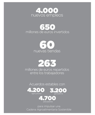 Mercadona es una empresa de supermercados española con 1.411 tiendas que emplea a 74.000 personas. En 2012 facturó 19.077 millones de euros, un 7% más que en 2011. Mercadona se esfuerza por satisfacer a sus clientes, empleados, proveedores y la sociedad mediante iniciativas como la creación de empleo estable, acuerdos con agricultores y pescad