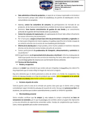 El documento describe las técnicas de merchandising y su importancia para las ventas. Explica que el merchandising estudia el comportamiento del consumidor y cómo presentar los productos de manera atractiva. Luego detalla varias técnicas como el uso de colores, la ubicación de productos y precios psicológicos. Concluye que estas técnicas garantizan las ventas al exhibir los productos de forma satisfactoria para los consumidores.