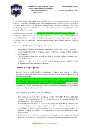 El merchandising es un conjunto de técnicas destinadas a estimular la compra en el punto de venta, influyendo en hasta el 75% de las decisiones del consumidor. Se clasifica en diferentes tipos, como merchandising de presentación, gestión y seducción, cada uno enfocado en maximizar la venta a través de la disposición de productos y la experiencia del cliente. A medida que el ciclo de vida del producto avanza, se requieren estrategias específicas de merchandising para mantener la rentabilidad y adaptación a las necesidades del mercado.