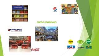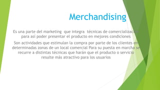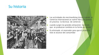 El documento habla sobre merchandising. Explica que es una técnica de marketing que busca presentar los productos de manera atractiva para estimular las ventas. Describe brevemente la historia del merchandising y cómo ha evolucionado desde los grandes almacenes hasta la aparición de supermercados e hipermercados. También menciona algunas técnicas comunes de merchandising como el uso de colores, exhibiciones, eventos promocionales y señalización para atraer a los clientes.