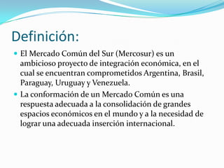 El documento describe el Mercado Común del Sur (Mercosur), un bloque económico formado por Argentina, Brasil, Paraguay y Uruguay. El Mercosur busca la integración económica de la región a través de la libre circulación de bienes y factores productivos, un arancel externo común, y la coordinación de políticas macroeconómicas. Además, el Mercosur cuenta con miembros asociados y observadores, y su logro principal ha sido establecer una zona de libre comercio entre sus países integrantes.