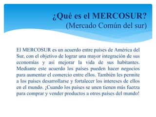 El MERCOSUR es un acuerdo de integración económica y política entre países de América del Sur, incluyendo Argentina, Brasil, Paraguay, Uruguay y Venezuela. Tiene como objetivos lograr la libre circulación de bienes, servicios y factores productivos entre los países miembros, establecer una política comercial común, y coordinar políticas macroeconómicas para fortalecer la integración regional. La Secretaría del MERCOSUR se encuentra en Montevideo, Uruguay, y se encarga de apoyar las reuniones y mantener los documentos y norm