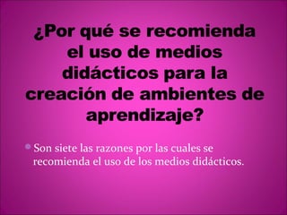 El documento describe los beneficios de los medios didácticos y su uso en la educación. Explica que permiten clases más dinámicas y facilitan la comunicación e intercambio de información. También describen los diferentes tipos de medios como pre-tecnológicos, audiovisuales, informáticos y tecnologías de la información. Se mencionan ejemplos como el correo electrónico y su uso para enviar trabajos entre estudiantes y profesores.