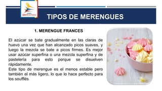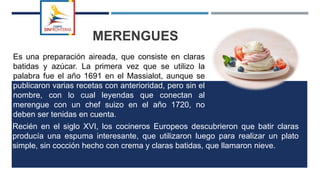 Este documento proporciona información sobre los merengues, incluyendo su historia, tipos y métodos de preparación. Explica que los merengues consisten en claras de huevo batidas con azúcar y que originalmente se llamaban "nieve". Describe tres tipos principales de merengue - francés, suizo e italiano - y sus características y usos respectivos.