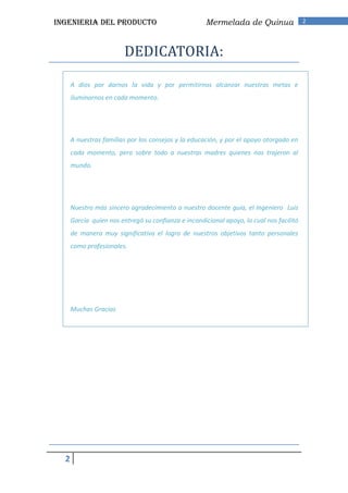 Este documento presenta el análisis de la necesidad de desarrollar una mermelada de quinua. Define la necesidad como satisfacer la demanda de alimentos saludables y nutritivos. Identifica que la mermelada de quinua cubriría esta necesidad al ser un producto diferente, de sabor agradable y con propiedades nutritivas. El objetivo es analizar el mercado potencial y desarrollar el concepto, diseño y plan de producción de la mermelada de quinua.