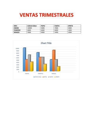 El documento presenta las ventas trimestrales de cuatro bebidas frescas populares: Coca Cola, Pepsi, Fanta y Sprite. En enero, Coca Cola tuvo las mayores ventas con 10,000 unidades, mientras que Sprite tuvo las menores con 4,000 unidades. Para marzo, Pepsi superó a Coca Cola como la bebida más vendida con 9,000 unidades.