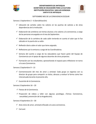 El documento presenta el plan del mes de septiembre para promover la convivencia escolar en la Institución Educativa San Luis Gonzaga en Santa Fe de Antioquia. Durante el mes se llevarán a cabo diferentes actividades como la ubicación de carteles sobre valores, elaboración de carteleras, reflexiones diarias, cuentos, conmemoración del amor y la amistad, eucaristía de la convivencia, fiestas de la convivencia con proyección de videos y talleres sobre diversos temas, y un acto cívico final