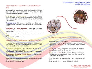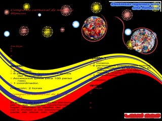 El documento describe tres opciones para una comparsa de carnaval. La Opción 1 incluye un músico, 6 personajes típicos del carnaval y un coordinador. La Opción 2 incluye dos músicos, los mismos 6 personajes y un coordinador, además de accesorios para 100 personas. Ambas opciones duran 2 horas. La comparsa de Barranquilla inicia con personajes y músicos desfilando e invitando a los asistentes a participar con sombreros.