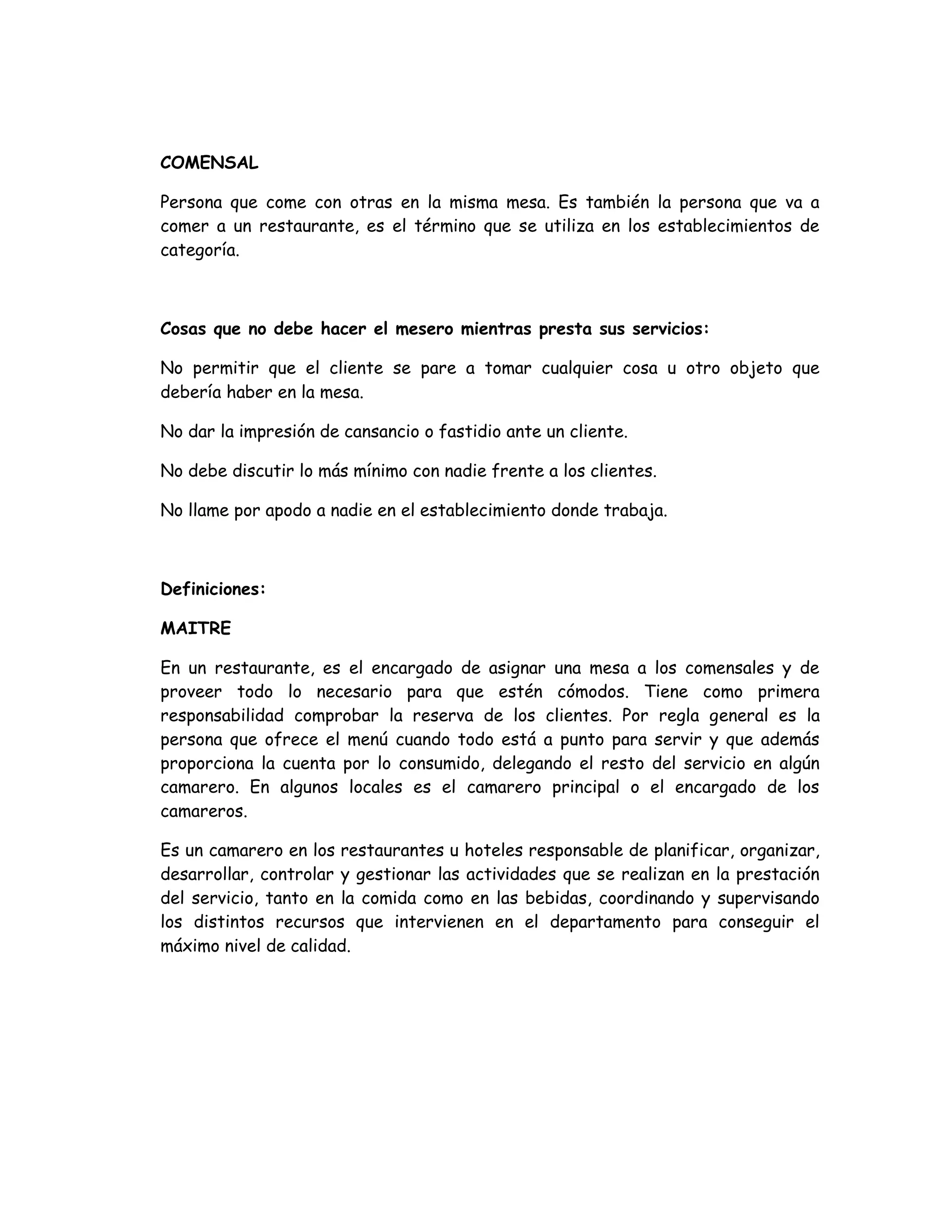 El documento describe los diferentes roles y responsabilidades del personal en un restaurante. Define términos como comensal, maître, primer maître, segundo maître, tercer maître, sumiller y hostess. Explica que cada rol juega un papel importante en la prestación de un excelente servicio al cliente y en el funcionamiento efectivo del restaurante.