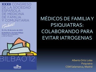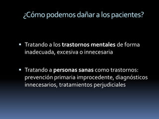 Este documento discute cómo los médicos de familia y psiquiatras pueden colaborar para evitar dañar a los pacientes. Identifica varios tipos de iatrogenia, incluida la prevención primaria inapropiada, diagnósticos innecesarios y tratamientos perjudiciales. También analiza los factores que favorecen el daño a los pacientes, como los mitos sociales sobre la salud mental y el enfoque médico-tecnológico. El objetivo es mejorar la atención y prevenir efectos adversos en los