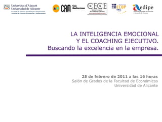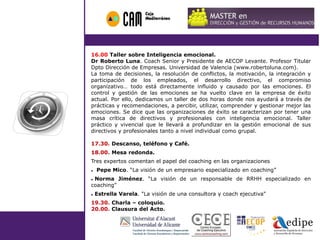 El documento describe un taller y evento sobre inteligencia emocional y coaching ejecutivo que tendrá lugar el 25 de febrero de 2011 en la Universidad de Alicante. El taller de la tarde tratará sobre inteligencia emocional y cómo gestionar las emociones en el trabajo. Después habrá una mesa redonda donde tres expertos hablarán sobre el papel del coaching en las organizaciones. El evento concluirá con una charla y clausura.