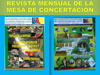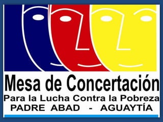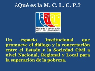 La Mesa de Concertación para la Lucha contra la Pobreza (MCLCP) es un espacio institucional que promueve el diálogo y la concertación entre el Estado y la sociedad civil a nivel nacional, regional y local para superar la pobreza. La MCLCP tiene entre sus funciones institucionalizar la participación ciudadana en el diseño, toma de decisiones y fiscalización de las políticas sociales del estado con el fin de lograr una mayor eficiencia, transparencia e integridad en la lucha contra la pobreza. El documento presenta varios proyect