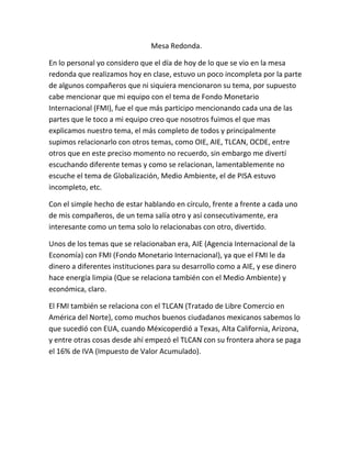 Este documento presenta un resumen de una mesa redonda realizada por estudiantes del Colegio de Bachilleres del Estado de Baja California sobre temas de geografía. Los estudiantes del grupo 508 discutieron varios temas como el Fondo Monetario Internacional, la Organización para la Cooperación y el Desarrollo Económicos y el Tratado de Libre Comercio de América del Norte, relacionándolos entre sí. Algunos temas como la globalización y el medio ambiente no fueron completamente cubiertos. El estudiante que esc