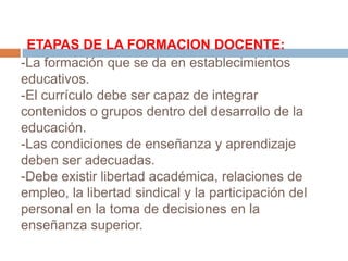 El documento habla sobre la importancia de asegurar la calidad en la formación docente. Menciona algunas etapas clave como la formación en establecimientos educativos, currículos integrales, y condiciones de enseñanza adecuadas. También recomienda formular políticas integrales para el desarrollo docente, estrategias de inducción, y supervisión de modelos de formación. Resalta la necesidad de optimizar recursos para lograr resultados educativos deseados y contribuir a una meta común a través de programas como educación inicial
