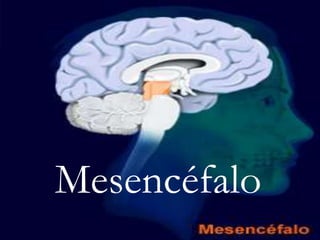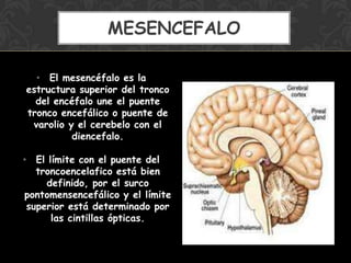 El documento describe la anatomía y función del mesencéfalo, protuberancia, bulbo raquídeo y cerebelo. El mesencéfalo contiene los pedúnculos cerebrales y es responsable de funciones como la visión, audición y movimiento ocular. La protuberancia aloja centros vitales que regulan la respiración, frecuencia cardíaca y presión sanguínea. El bulbo raquídeo transmite impulsos a la médula espinal y controla centros vitales. El cerebelo coordina el movimiento y facilita el