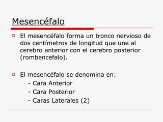 El mesencéfalo es una parte del tronco encefálico que conecta el cerebro anterior y posterior. Está compuesto por los pedúnculos cerebrales, el espacio interpeduncular, y los tubérculos cuadrigéminos. Contiene varios núcleos importantes como el núcleo rojo y el haz longitudinal posterior, así como estructuras como el acueducto de Silvio. Irrigado por varias arterias, el mesencéfalo juega un papel clave en las funciones motoras y visuales.