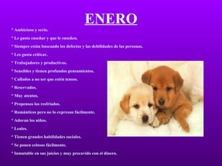 Este documento describe las características generales asociadas con cada mes del año según la fecha de nacimiento. Ofrece detalles sobre la personalidad, temperamento, intereses y tendencias de salud típicas de las personas nacidas en cada mes. Cubre una amplia gama de características tanto positivas como negativas para cada período, aunque reconoce que estas generalizaciones no se aplican necesariamente a cada individuo.