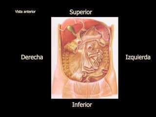 El documento describe el mesenterio, incluyendo su definición como un meso que conecta el yeyuno e íleon a la pared posterior del abdomen, con una inserción parietal y una inserción intestinal, y dos hojas. También enumera su contenido de arterias, venas, vasos linfáticos y nervios.