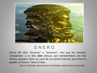 El documento describe brevemente el origen de los nombres de los meses del calendario romano. Julio César y Augusto agregaron meses con sus nombres (Julio y Agosto) al calendario de 10 meses, desplazando los meses restantes. También resume el origen de los nombres de los días de la semana en latín, asociados a dioses romanos como Marte, Mercurio y Júpiter.