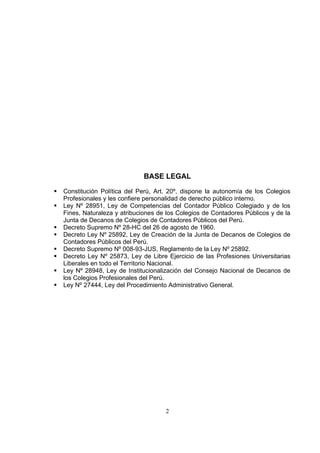 Este documento presenta el Código de Ética Profesional para Contadores Públicos Colegiados en Perú. Establece cinco principios fundamentales de la ética profesional que incluyen integridad, objetividad, competencia profesional, confidencialidad y comportamiento profesional. Además, describe el alcance y aplicación del código, así como normas generales sobre responsabilidad profesional, secreto profesional, independencia de criterio y relaciones con otros colegas. Finalmente, presenta los órganos institucionales encargados de hacer