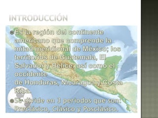 El documento resume las principales características de los periodos preclásico, clásico y posclásico de la historia mesoamericana, desde los inicios de la agricultura sedentaria hasta la llegada de los europeos. Describe el desarrollo de la agricultura, la cerámica, la arquitectura, la escritura, la numeración y las diferencias sociales entre las aldeas iniciales y los posteriores estados con elites gobernantes y sacrificios humanos. Finalmente, señala que la historia mesoamericana concluye con la conqu