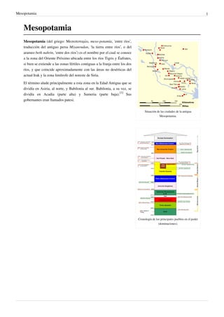 Mesopotamia se refiere a la región entre los ríos Tigris y Éufrates, donde surgió una de las primeras civilizaciones. Los sumerios crearon las primeras ciudades-estado y desarrollaron la escritura, la rueda y el cálculo. Más tarde, Sargón de Acadia conquistó las ciudades sumerias y estableció el primer imperio. Tras su caída dominaron los gutis, pero luego surgió el Renacimiento sumerio bajo los reyes de Ur. Finalmente los amorreos inv