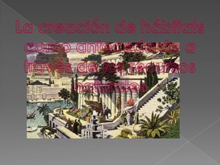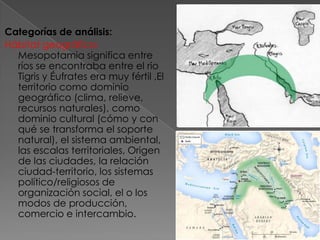 El documento describe los recursos naturales y geográficos de Mesopotamia. La región entre los ríos Tigris y Éufrates era muy fértil y producía cultivos como cebada y dátiles. También había bosques, ríos y canales que proporcionaban recursos de caza, pesca y ganadería como ovejas, cabras y bueyes. Los recursos minerales incluían arcilla, nafta y betún. Mesopotamia también obtenía recursos externos como metales y piedras a través del com