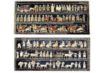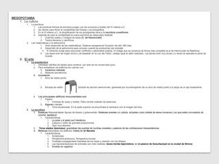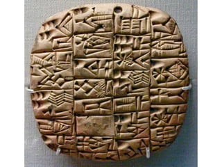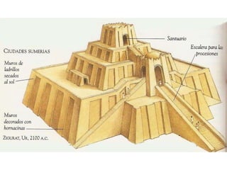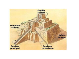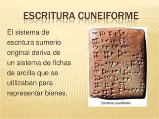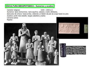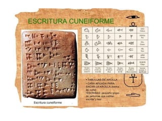 Mesopotamia fue cuna de importantes avances culturales como la escritura cuneiforme, el desarrollo de las matemáticas y la astronomía, y el surgimiento del derecho con códigos como el de Hammurabi. La arquitectura incluía edificios como palacios, zigurats y el uso del arco y la bóveda. Las artes incluían estatuas orantes, toros alados y relieves con fines propagandísticos en edificios y estelas reales.