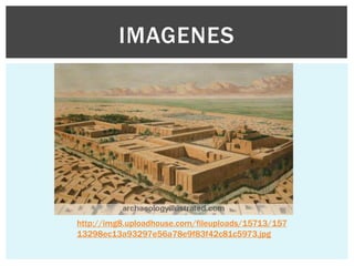 Mesopotamia fue una antigua civilización que floreció entre los ríos Tigris y Éufrates. Incluye imágenes de zigurats, mapas políticos que muestran las diferentes ciudades-estado de la región, y fotos de ruinas de antiguas ciudades como Babilonia que dan una idea de la arquitectura y cultura mesopotámica.