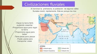 Las primeras civilizaciones históricas surgieron en las regiones fluviales de Mesopotamia y Egipto debido a que los ríos proveían tierra fértil para la agricultura y agua para regar los cultivos, beber y transportar bienes. La civilización mesopotámica se desarrolló entre los ríos Tigris y Éufrates desde el 3500 a.C. hasta el 539 a.C., estableciendo ciudades-estado gobernadas inicialmente por sacerdotes y luego por reyes, y desarrollando la