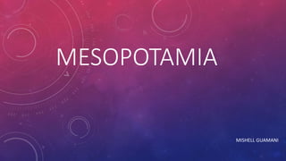 Mesopotamia se desarrolló entre los ríos Tigris y Éufrates en lo que hoy es Irak. Se dividía en las regiones de Asiria al norte y Babilonia al sur. Los primeros pueblos que habitaron la región fueron los sumerios, acadios y caldeos. El rey ejercía un poder absoluto como máxima autoridad política y religiosa, aunque no era considerado un dios.