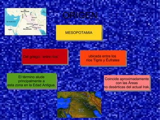 El documento proporciona información sobre la antigua Mesopotamia, incluyendo su ubicación entre los ríos Tigris y Éufrates, su historia desde los primeros asentamientos agrícolas hasta la aparición de la escritura, y describe brevemente las culturas sumeria, acadia, asiria y babilonia, centrándose en aspectos como su economía, política, religión y desarrollos científicos y culturales.