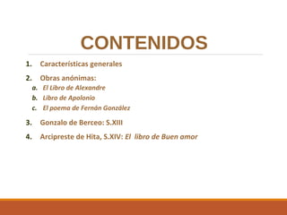 Este documento presenta un resumen de las características generales del Mester de clerecía, una de las formas poéticas predominantes en la literatura española medieval. Se divide en dos partes, la primera describe las obras anónimas y los autores Gonzalo de Berceo y el Arcipreste de Hita. La segunda parte contrasta el Mester de clerecía con el Mester de juglaría en términos de autoría, intención, fuentes, difusión, temática y métrica.