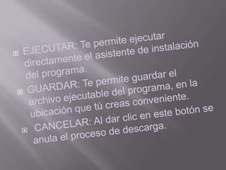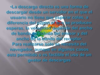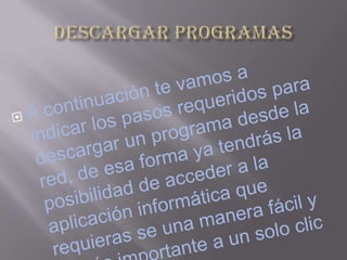 El documento describe cómo la Internet proporciona información sobre diversos temas y aplicaciones informáticas para realizar diferentes acciones. Explica dos métodos para descargar archivos desde Internet: servicios de descarga directa de páginas web o a través de empresas que ofrecen almacenamiento en la nube pero que requieren esperas, contraseñas o pagos. También detalla los pasos para descargar e instalar aplicaciones desde una página web de programas.