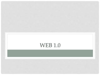 Este documento describe las características de la Web 1.0, 2.0 y 3.0. La Web 1.0 consistía en páginas estáticas creadas con HTML, mientras que la Web 2.0 permitió el desarrollo de aplicaciones sociales interactivas. La Web 3.0 usa la inteligencia artificial para conectar y analizar información de manera proactiva.