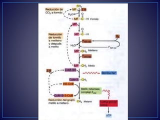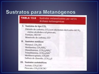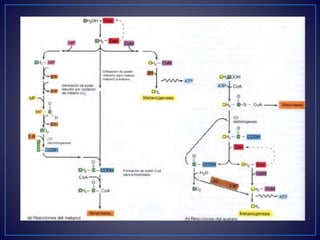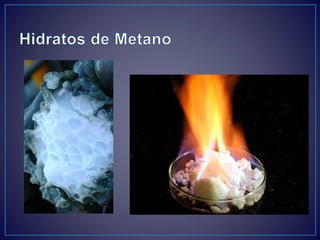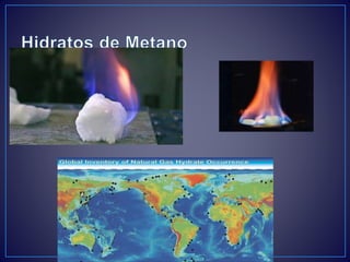 Este documento describe los principales procesos y fuentes de producción de metano a nivel mundial. Explica que el metano se produce principalmente a través de la metanogénesis bacteriana y la descomposición de materia orgánica. Las principales fuentes son la agricultura y la ganadería, los pantanos naturales, el arroz y los vertederos. También se mencionan los hidratos de metano como una posible futura fuente de energía.