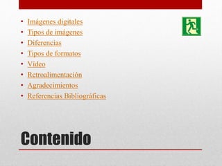 Este documento describe diferentes tipos de imágenes digitales, incluyendo mapas de bits e imágenes vectoriales. También explica varios formatos comunes de archivos de imágenes como JPG, PNG, GIF, BMP y TIFF, detallando las características y usos de cada uno. Finalmente, incluye referencias bibliográficas relacionadas con imágenes digitales.