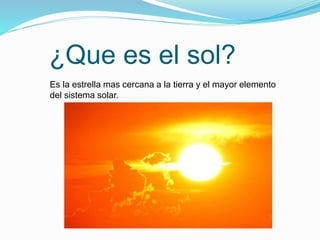 El documento describe la naturaleza del Sol. El Sol es la estrella más cercana a la Tierra y contiene más del 99% de la materia del sistema solar, ejerciendo una fuerte atracción gravitatoria sobre los planetas. Aunque sólo vemos la capa exterior del Sol llamada fotosfera, con una temperatura de unos 6.000°C, en realidad es una bola de gas compuesta principalmente de hidrógeno y helio. Cada segundo en el Sol se convierten 700 millones de toneladas de hidrógeno en cenizas de helio, liberando 5