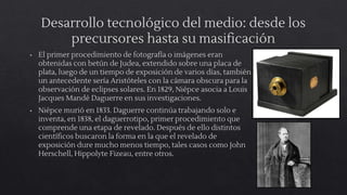 Este documento describe la historia y el desarrollo tecnológico de la fotografía desde sus inicios hasta su masificación. Comienza con los primeros experimentos de Niépce y Daguerre en la década de 1820 y continúa detallando mejoras como el daguerrotipo y los esfuerzos para acortar los tiempos de revelado. También analiza el impacto social de la fotografía y su uso para fines publicitarios y de propaganda, así como los beneficios y consecuencias negativas del medio. Finalmente, incluye una