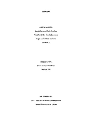 Este documento presenta un plan de meta para tres aprendices, María Angélica Jurado Penagos, Claudia Esperanza Pérez Fernández y Julieth Marisella Vargas Mora. El plan es presentado al instructor Nelson Enrique Vera Prieto en el Centro de Desarrollo Agro empresarial del SENA el 20 de abril de 2013 para el curso de Gestión empresarial.
